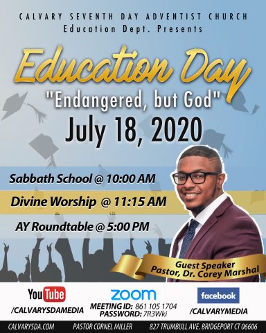 1. Education Day is next Sabbath, July 18th. The guest speaker is Pastor Corey Marshall. Theme for the day is “Endangered”. AY will begin at 5 pm with a panel discussion. Please join us as we celebrate “Education”
